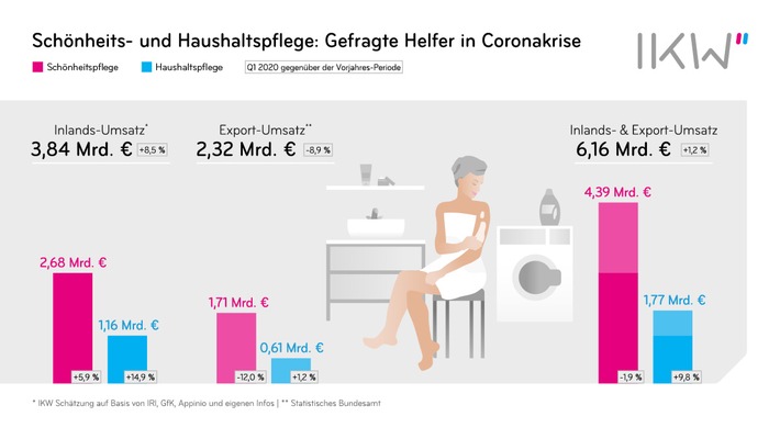 Nach einer Schätzung des Industrieverbands Körperpflege- und Waschmittel (IKW) stieg der Inlands-Umsatz mit Produkten der Schönheits- und Haushaltspflege in den ersten drei Monaten des Jahres um 8,5 Prozent auf 3,84 Milliarden Euro. Ausgewertet wurden hierfür Daten der Marktforschungsinstitute IRI Information Resources, der Gesellschaft für Konsumforschung (GfK) und Appinio, des Statistischen Bundesamtes sowie eigene Quellen. Wachstumstreiber im deutschen Markt waren demnach die Haushaltspflegeprodukte mit einem Plus von 14,9 Prozent. Schönheitspflege legte um 5,9 Prozent zu.