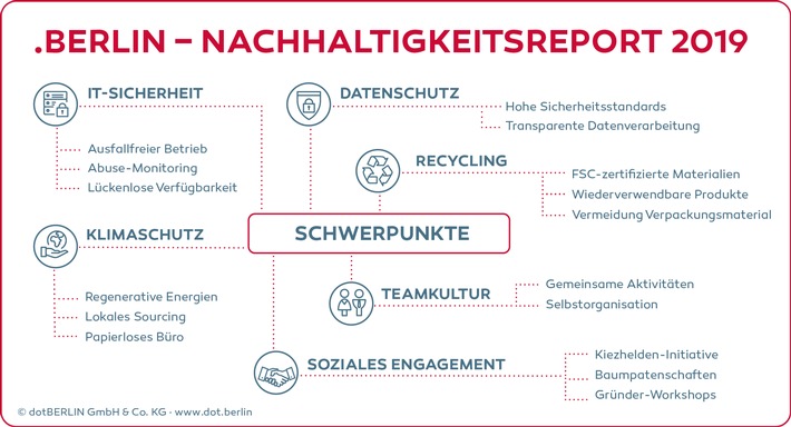 Insgesamt orientiert sich der Nachhaltigkeitsreport an den Handlungsfeldern des Global Reporting Institute (GRI), dem weltweit am meisten genutzten Rahmenwerk der Nachhaltigkeitsberichterstattung. Außerdem unterstützt dotBERLIN die 17 Nachhaltigkeitsziele der Vereinten Nationen, die eine nachhaltige Entwicklung in ökologischer, ökonomischer und sozialer Hinsicht umfassen. Besonders in den Fokus stellt dotBERLIN unter anderem „Ziel 8 – Menschenwürdige Arbeit und Wirtschaftswachstum“, „Ziel 9 – Industrie, Innovation und Infrastruktur“ und „Ziel 11 – Nachhaltige Städte und Gemeinden“.