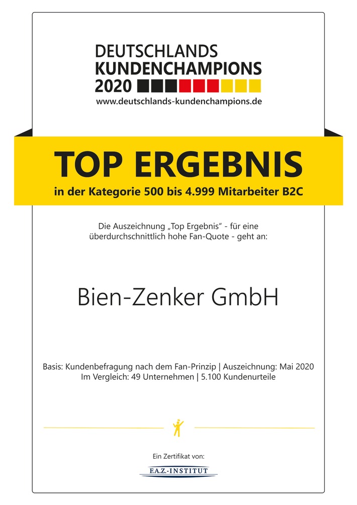 Grundlage für die Auszeichnung „Deutschlands Kundenchampions“ ist eine Kundenbefragung mit knapp 23.000 Kundeninterviews. Der Kern der Studie ist das“Fan-Prinzip“, das die relevanten Kriterien für den Unternehmenserfolg abbildet. Erfolgreich ist demnach, wer mit einer ganzheitlichen Sicht auf alle Unternehmensbereiche und -prozesse ein herausragendes Kundenbeziehungsmanagement auf die Beine stellt. Beim Fan-Prinzip wird in fünf Kundengruppen unterschieden: Fans, Sympathisanten, Söldner, Gefangene und Gegner. Mit 53 Prozent Fans und Sympathisanten offenbarten deutlich über die Hälfte der befragten Kunden eine enge Bindung an die Marke Bien-Zenker.