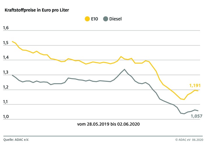 München (ots) – Die Kraftstoffpreise an den deutschen Tankstellen haben im Vergleich zur vergangenen Woche leicht nachgegeben. Wie die aktuelle Auswertung des ADAC zeigt, sank der Preis für einen Liter Super E10 gegenüber der Vorwoche im bundesweiten Mittel um 0,5 Cent auf 1,191 Euro. Ãhnlich der Preisrückgang bei Diesel: Ein Liter kostet derzeit im Schnitt 1,057 Euro, das ist ein Minus von 0,6 Cent. Damit ist der Anstieg an den Zapfsäulen, den der ADAC in den vergangenen vier Wochen registriert hatte, fürs Erste gestoppt.
