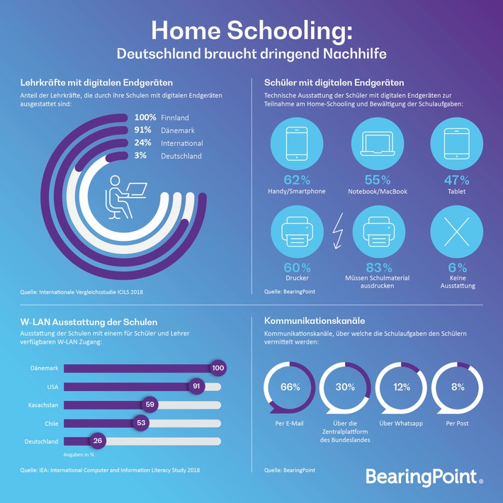 „Zu lange wurde es versäumt, die Bildung in die digitale Welt zu überführen, jetzt erleben wir die Nachteile. Die Corona-Krise könnte aber zum Treiber werden: Weil sie gnadenlos die Schwachstellen im Bereich Digitale Bildung offengelegt hat, können diese nun effizienter behoben werden. Die aktuelle Situation ist allerdings kein einmaliges Erdbeben, das nur kurzfristige Lösungen benötigt. Vielmehr ist langfristiges und konstruktives Handeln aller Beteiligten gefragt, damit die umfangreichen Mittel des Digitalpakts der Bundesregierung ungehindert auf die StraÃe gebracht werden und wir mit Vollgas in Richtung Zukunft losfahren können. Ein Kollaborationsmodell von Bund, Ländern, Kommunen und Schulen, das ein pädagogisch-digitales Gesamtkonzept ermöglicht und zu einem bundesweiten Mindeststandard für Digitale Bildung führt, sollte das erste Etappenziel sein“, resümiert Iris Grewe, Deutschlandchefin von BearingPoint.