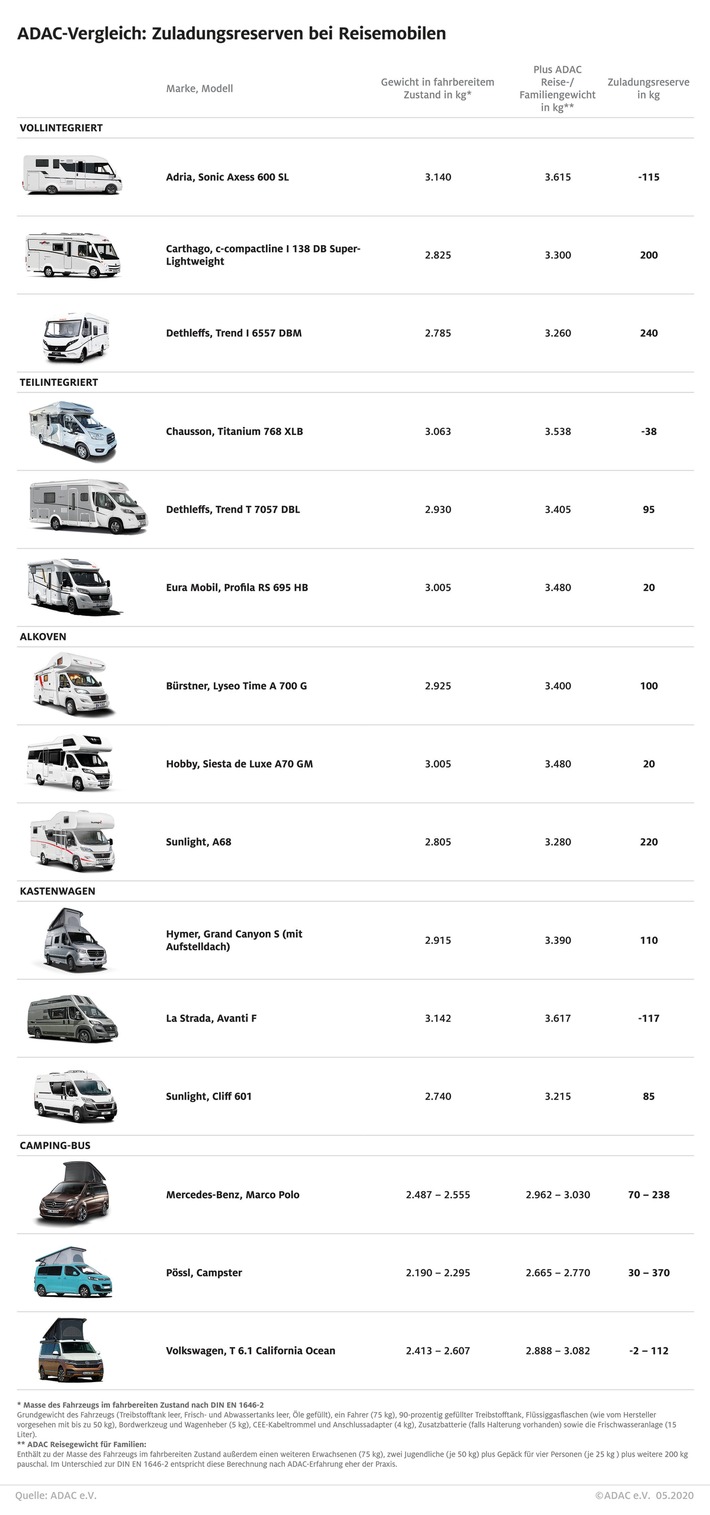 Bei den groÃen Wohnmobilen gibt es deutliche Unterschiede, doch auch hier stoÃen manche Modelle schnell an ihre Zuladungsgrenzen. So bietet der Adria VI Sonic Axess 600 SL aus der Klasse der vollintegrierten Wohnmobile mit einer Länge von fast sieben Metern zwar viel Platz und Schlafmöglichkeiten für vier Personen. Steigt die ADAC Familie aber samt definiertem Gepäck ein, ist das Reisemobil mit 115 kg überladen. Die wirkt sich nicht nur nachteilig auf die Fahrdynamik aus, bei einer Kontrolle kann es zudem richtig teuer werden.