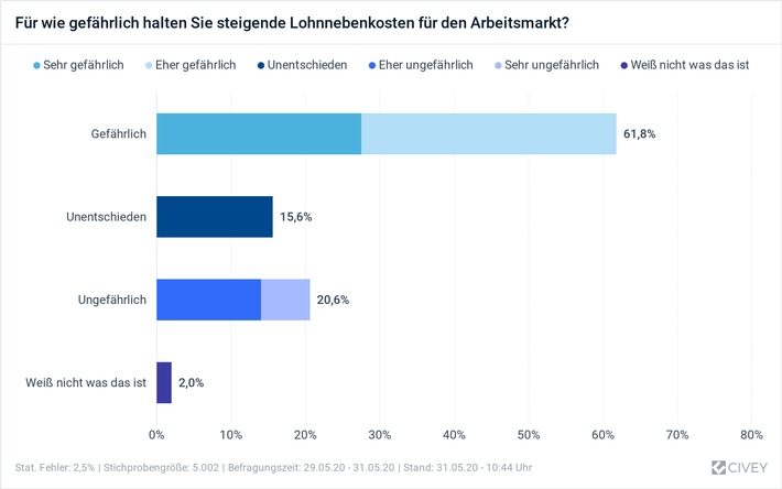 Berlin (ots) – Aktuell geht jeder fünfte Fall von Arbeitslosigkeit auf das Konto der Corona-Pandemie. Tendenz weiter steigend. Die drastisch steigenden Ausgaben der Sozialkassen drohen durch Beitragssteigerungen den Arbeitsmarkt zusätzlich zu belasten. Diese Gefahr sieht auch eine große Mehrheit der Bürgerinnen und Bürger. Laut einer aktuellen Civey-Umfrage (http://link.mediaoutreach.meltwater. com/ls/click?upn=A-2Fi-2FVVp-2B-2FgJrcqF5n7MUv-2BaidF8yq6bErgaxhnq8psbQzmlmvfpFk msvSR2BpD1ht6mF_r5rOVA-2FnFnbzUEN99GXvs2-2F3Kt-2Bit5H-2B9DwcYCMZL-2BG-2F6Keo78ou Tvfunbzpss4c38ta5xsDwMTM-2FxZuh9g91u4rgu0q2hacwyRqVUF4yuyBZWUc0qXdWfePdIZACdmPW2 eqAXMjlCnVj62XGIO1VjOtAZbt9RlUunQkTG9EIPTivQVgpXn1cin9m-2ByNQ-2B4jA9XHevMRdU8Lqp 4a7A2LtCCrw2ZAyPYwNaPsdsjWLtlxDFPf3qeX6x7uF5UJGm6fU-2BRC1H1DExmXtCd-2FTJCdF9UumR zOaVwkkZREZ7V3nhtD-2F6eNvvmHzJkcy9rntH2r3rQ-2BEe8ENztL9lQbzr8HPX7txjGUs0H8DDSiRE f-2Bgr8jHWb2IHk9-2FhjEPviFPSaXWguspr1iqlKBG21U-2B68Z4A-3D-3D) halten 62 Prozent steigende Lohnnebenkosten für gefährlich, während nur 21 Prozent steigende Lohnnebenkosten für ungefährlich halten.