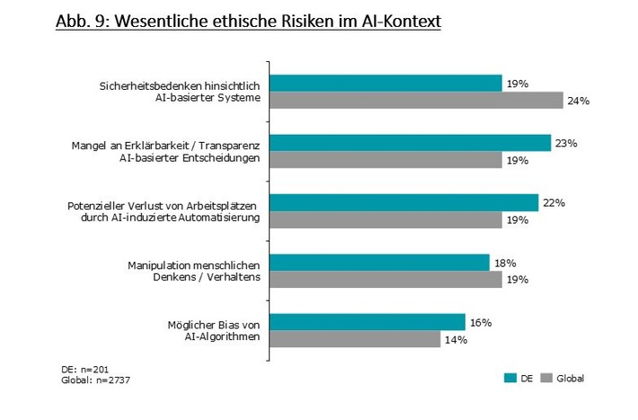 Trotz ihrer technologischen und ökonomischen Bedeutung birgt künstliche Intelligenz auch Risiken, die in ihren unterschiedlichen Ausprägungen immer wieder Gegenstand der öffentlichen Diskussion sind. Während in den acht Vergleichsmärkten Sicherheitsbedenken beim Einsatz von AI als größtes Risiko wahrgenommen werden (24 Prozent), sorgen sich deutsche Experten vergleichsweise stark um mangelnde Transparenz (23 Prozent), den Verlust von Arbeitsplätzen (22 Prozent) und den „algorithmic bias“, also eine systematische, unfaire Verzerrung durch die Anwendung von Algorithmen (16 Prozent). Hier ist allerdings zu beachten, dass bei der Risikobewertung auch kulturelle Faktoren eine Rolle spielen, so ist die Angst vor Arbeitsplatzverlusten in Deutschland traditionell besonders ausgeprägt.