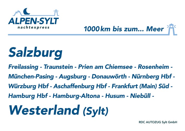 Westerland/Sylt (ots) – Reiseziele wie die Küsten Schleswig-Holsteins oder die Alpenregion sind in diesem Jahr besonders nachgefragte Destinationen. Mit dem neuen ALPEN-SYLT Nachtexpress bietet das private Eisenbahnverkehrsunternehmen RDC-Gruppe Fahrgästen nun für die Monate Juli bis September eine stau- und stressfreie Anreise in beide Richtungen.