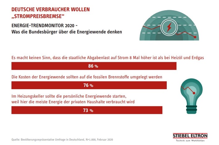 Holzminden (ots) – Die Strompreisbremse im jüngsten Corona-Konjunkturpaket der Bundesregierung trifft auf Zustimmung bei den Verbrauchern: 86 Prozent kritisieren, dass die staatliche Abgabenlast auf Strom 8 Mal höher ausfällt als bei Heizöl und Erdgas. Nicht einmal jeder zehnte Bundesbürger ist davon überzeugt, dass die Energiewende mit hohen Zusatzkosten auf Strom finanziert werden sollte. Das sind Ergebnisse aus dem Energie-Trendmonitor 2020. Dafür wurden bevölkerungsrepräsentativ 1.000 Bundesbürger von einem Marktforschungsinstitut im Auftrag von Stiebel Eltron befragt.
