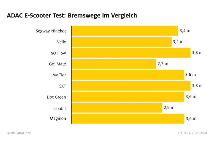 Im Vergleich zum Vorjahres-Test ist das Preisniveau der E-Scooter deutlich gefallen, doch die günstigen Preise gehen nach Ansicht des ADAC vor allem zu Lasten der Sicherheit. So registrierten die Tester des Clubs im Test aus dem vergangenen Jahr, bei dem das Preisniveau der elektrischen Tretroller noch deutlich höher lag, deutlich bessere und kürzere Bremswege. Die meisten Scooter kamen bei einer Geschwindigkeit von 20 km/h nach etwa zwei Metern zum Stehen. In diesem Jahr hat sich der Bremsweg beim identischem Testverfahren im Durchschnitt auf 3,4 Meter verlängert. An der Qualität der Bremsen zu sparen kann aber unter Umständen lebensgefährlich sein. Nach Ansicht des ADAC sollten bei E-Scootern beide Räder, insbesondere aber das Vorderrad, über eine mechanische Bremse verfügen.