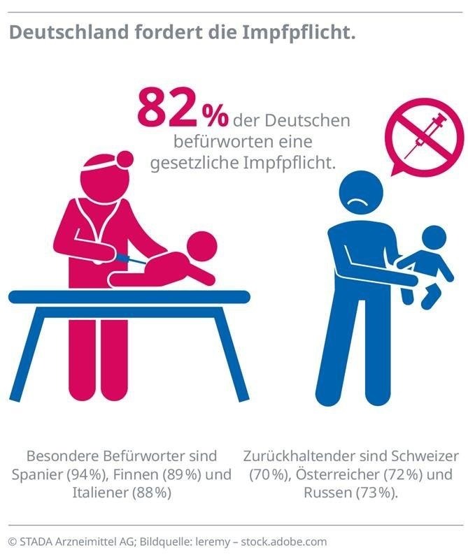 Der zweite internationale STADA Health Report zeigt, wie unterschiedlich die Menschen in Europa mit zukunftsweisenden Gesundheitsthemen umgehen. Das gilt auch für die Deutschen, die in vielen Fragen eine Sonderrolle einnehmen. Im genauen europäischen Durchschnitt liegen allerdings die deutschen Befürworter einer Impfpflicht: 82 Prozent der Bundesbürger würden eine solche begrüßen. Einen entsprechend schweren Stand haben Impfgegner in Deutschland. Nur zwölf Prozent geben an, sie können Impfgegner verstehen und drei Prozent sagen, sie seien selbst Impfgegner. Dagegen stehen 77 Prozent der Bevölkerung, die Impfgegner verurteilen. Genau jeder Dritte sagt sogar: „Ganz ehrlich: Ich halte Impfgegner für Idioten.“ Noch offener für eine Impfpflicht sind vor allem Spanier mit 94 Prozent. Weniger Befürworter sind in Österreich (72 Prozent) und der Schweiz (70 Prozent) zu finden.