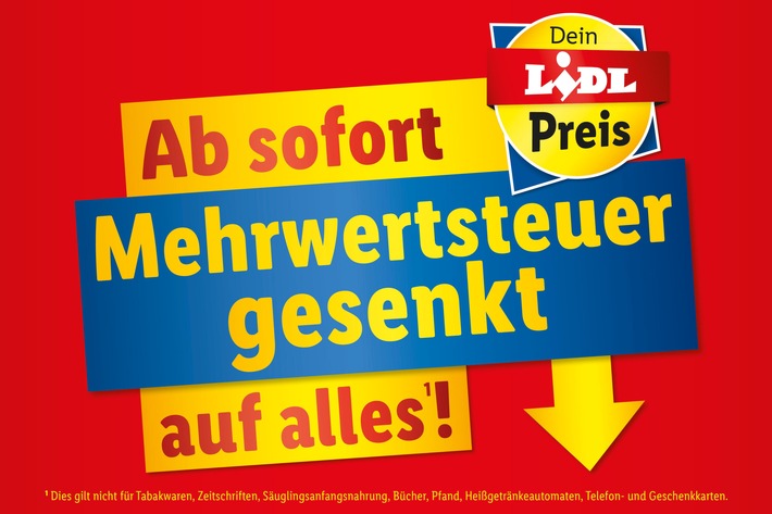 Neckarsulm (ots) – Lidl setzt in diesen herausfordernden Zeiten ein weiteres Zeichen und schenkt seinen Kunden als erster Lebensmitteleinzelhändler die Mehrwertsteuersenkung bereits über eine Woche früher: Während das Konjunkturpaket der Koalition eine Senkung des Mehrwertsteuersatzes ab 1. Juli 2020 vorsieht, geht Lidl Deutschland voran und senkt ab 22. Juni 2020 die Preise. Dadurch unterstreicht der Einzelhändler zum wiederholten Mal den Anspruch, seinen Kunden das beste Preis-Leistungsverhältnis zu bieten. Die Preissenkung erfolgt direkt an den Artikeln am Regal und ist für die Kunden über das jeweilige rote Preisschild in der Filiale transparent nachvollziehbar. An der Kasse findet kein pauschaler Abzug statt. Auch bei den Produkten im Onlineshop hat Lidl die Mehrwertsteuer gesenkt. Ausgenommen von der Preissenkung sind Tabakwaren, Zeitschriften, Säuglingsanfangsnahrung, Bücher, Pfand, Getränke aus Heißgetränkeautomaten, Telefon- und Geschenkkarten.