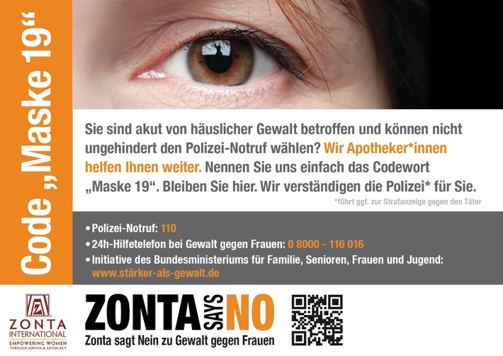 „Die Corona-Pandemie hat uns auch in Deutschland vor Augen geführt, dass es im Schutz von Frauen vor häuslicher Gewalt empfindliche Lücken gibt. Mit Unterstützung der Zonta Clubs und unserer Partner wollen wir durch „Code Maske 19″ dazu beitragen, diese zu schließen“, erklärt Christiane Walter, Präsidentin der Union deutscher Zonta Clubs für das Biennium 2018 bis 2020. „Apotheker und Ärzte unterliegen der Schweigepflicht. Die Notrufhilfe in Apotheke, Klinik und Praxis könnte dauerhaft eine zusätzliche Schutzfunktion bieten. Das Codewort erleichtert Betroffenen, auch unabhängig vom Lockdown in Coronazeiten, sich in einem Vertrauensumfeld akut Hilfe zu holen, ohne selbst die Polizei anrufen oder sich lange erklären zu müssen.“ Die Aktion „Code: Maske 19“ findet unter dem Dach der weltweiten Zonta International-Kampagne „Zonta Says NO“ gegen Gewalt an Frauen statt. Der Union deutscher Zonta Clubs gehören 136 Clubs an, mit denen die überparteiliche Nichtregierungsorganisation berufstätiger Frauen Zonta International allein in Deutschland in mehr als 100 Städten und Kommunen vertreten ist.
