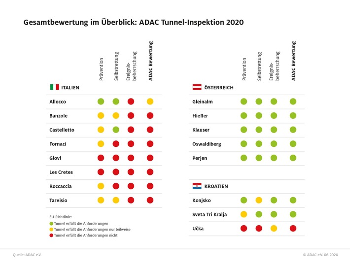 München (ots) – Das Ergebnis ist ernüchternd: Über die Hälfte der inspizierten Tunnel erfüllt die Mindestanforderungen der Europäischen Union für Sicherheit in europäischen Straßentunneln nicht. Zu diesem Ergebnis kommt eine aktuelle Untersuchung des ADAC, bei der der Club mittels Sichtprüfungen und Abstandsmessungen 16 Tunnel auf wichtigen Reiserouten im transeuropäischen Straßennetz in Italien, Kroatien und Österreich geprüft hat.