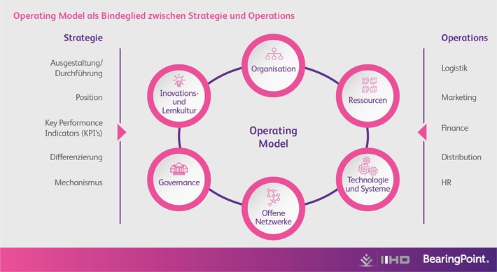 Das Betriebsmodell nimmt eine zentrale Rolle ein, indem es die Strategie mit den operativen Prozessen und Aktivitäten des Unternehmens synchronisiert und damit überhaupt erst ermöglicht, Mehrwerte zu schaffen (vgl. Abbildung). „Es ist das Betriebsmodell, das festlegt, was ein Unternehmen tun muss, welche Fähigkeiten hierzu in welcher Funktion und Hierarchieebene benötigt werden, wie Ressourcen bereitgestellt, an welcher Stelle und wie Entscheidungen getroffen werden und welchen Verhaltensprinzipien der Zusammenarbeit man sich verpflichtet fühlt“, so Kay Manke.
