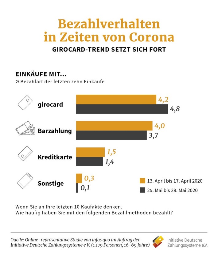 Berlin (ots) – Auch fast drei Monate nach Beginn der ersten Abstandsregelungen setzt die Bevölkerung an der Kasse vermehrt auf Karte und Kontaktlos. Zurzeit erfolgen fast die Hälfte aller Bezahlvorgänge per girocard. Das zeigt eine repräsentative infas quo-Umfrage im Auftrag der Initiative Deutsche Zahlungssysteme. Das Marktforschungsinstitut begleitet die Krise mit regelmäßig stattfindenden Online-Befragungen, die jüngste Erhebung zeigt: Mit sinkenden akuten Infektionszahlen bleibt die Motivation der Bevölkerung für die Kartenzahlung bestehen.