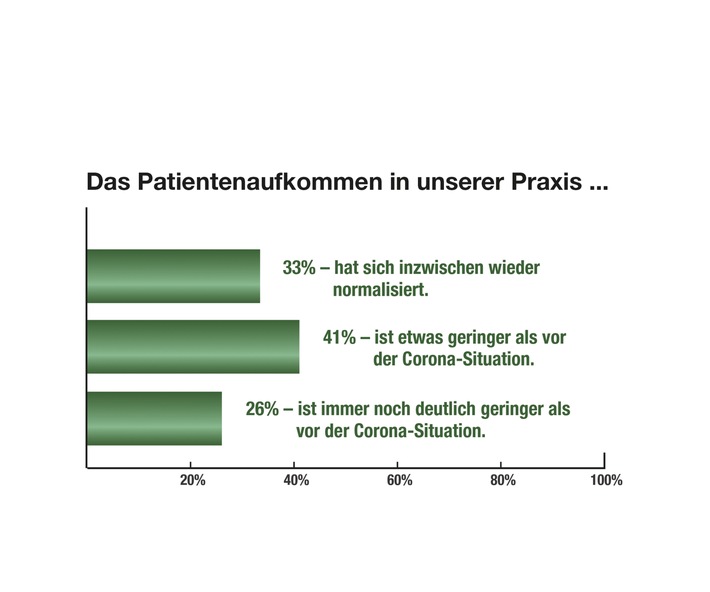 Nur jeder dritte Arzt (33 %) gab an, dass die Zahl der Patienten in der eigenen Praxis inzwischen wieder den Vor-Corona-Wert erreicht habe. 41 Prozent erklärten, dass die Besuche immer noch „etwas niedriger“ seien, 26 Prozent sehen dagegen „deutlich weniger“ Patienten als vor der Corona-Zeit.
