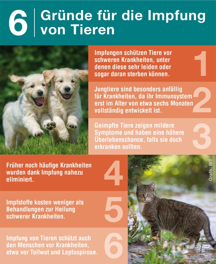 Auch der Schutz der Tiere, die unser Leben und unser Zuhause mit uns teilen, ist wichtig. Regelmäßige Impfungen gegen die wichtigsten Krankheiten sind wesentlicher Bestandteil der Fürsorge durch den verantwortungsvollen Besitzer. Das Tier selbst ist geschützt, aber auch das Krankheitsrisiko für andere Tiere in der Umgebung wird gesenkt und Mensch und Tier können unbeschwert zusammenleben.