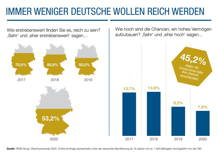 Nur noch 53,2 Prozent der Deutschen finden es erstrebenswert, reich zu sein. Dies stellt einen kontinuierlichen Rückgang seit dem Jahr 2017 (damals 70,0 Prozent) dar. Gleichzeitig werden die Chancen beim Vermögensaufbau immer schlechter eingeschätzt, wie die Ergebnisse der 4. Reichtumsstudie der RWB Group, einem Spezialisten für Private-Equity-Dachfonds, zeigen. Die repräsentative Umfrage wird jährlich vom Marktforschungsinstitut GfK durchgeführt.