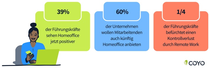 Das Hamburger Unternehmen COYO (https://www.coyoapp.com/) veröffentlicht heute eine Umfrage zum Thema Homeoffice in Deutschland. Diese zeigt, dass 39 Prozent der deutschen Führungskräfte nach der notwendigen Umstellung auf Homeoffice durch die Corona-Pandemie insgesamt positiver auf das Arbeiten von Zuhause aus blicken. Trotzdem sind weiterhin Befürchtungen rund um Qualitätseinbußen sowie Kontrollverluste in den Köpfen deutscher Manager vorhanden.
