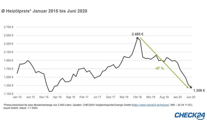 Der Heizölpreis (https://www.check24.de/heizoel/heizoelpreise/) ist so günstig wie lange nicht. Aktuell kosten 3.000 Liter durchschnittlich 1.306 Euro. Günstiger war die gleiche Abnahmenge zuletzt im Februar 2016. Im Vergleich zur Preisspitze im Oktober 2018 (Ø 2.485 Euro) zahlen Verbraucher derzeit 47 Prozent weniger. Allein im ersten Halbjahr 2020 ist der Heizölpreis um 31 Prozent gesunken.