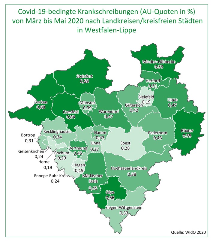 Regionale Unterschiede im Covid-19-Infektionsgeschehen spiegeln sich auch im Arbeitsunfähigkeitsgeschehen wider. Die höchste AU-Quote lag im Kreis Coesfeld (0,84 Prozent) gefolgt von den Kreisen Borken (0,68 Prozent), Olpe (0,66 Prozent), Steinfurt (0,59 Prozent) und Höxter (0,55 Prozent). Hingegen waren die Corona-bedingten AU-Quoten in Hagen, Herne und Bielefeld (je 0,19 Prozent), Gelsenkirchen und dem Ennepe-Ruhr-Kreis (0,24 Prozent) im westfälisch-lippischen Vergleich am geringsten.
