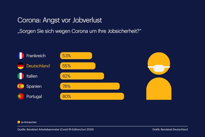 Die gestiegene Sorge vor dem Jobverlust ist nicht nur in Deutschland zu spüren. In Frankreich denkt mehr als die Hälfte der Arbeitnehmer (53%), dass sich die Auswirkungen der Corona-Pandemie negativ auf die Sicherheit ihrer Arbeitsplätze auswirkt. In Italien sind etwa sechs von zehn Arbeitnehmern besorgt. „Besonders groß ist die Angst in Portugal und Spanien“, sagt Dr. Christoph Kahlenberg. In beiden Ländern gehen etwa 80% der Arbeitnehmer davon aus, dass ihr Arbeitsplatz auf der Kippe steht.