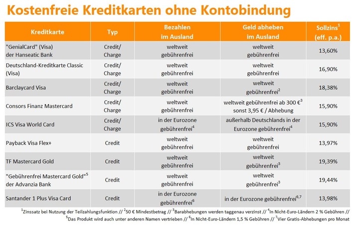 „Bei allen kostenfreien Kreditkarten wird den Karteninhabern ein Kreditrahmen eingeräumt“, sagt Oliver Maier, Geschäftsführer der Verivox Finanzvergleich GmbH. „Verbraucher sollten darauf achten, dass sie ihre Kreditkartenrechnung immer pünktlich zur Fälligkeit vollständig bezahlen. Wer die Teilzahlungsfunktion in Anspruch nimmt, muss je nach Karte teilweise hohe Kreditzinsen zahlen.“