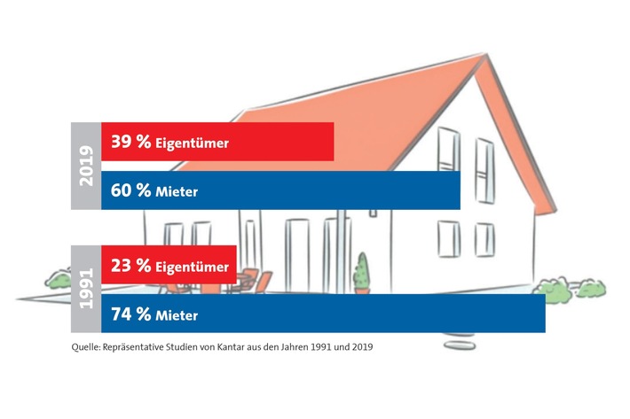 Potsdam (ots) – Am 1. Juli feierte die LBS Ostdeutsche Landesbausparkasse AG (LBS) ihr 30-jähriges Bestehen. Noch vor der Wiedervereinigung gegründet, ist sie nach wie vor die einzige ostdeutsche Bausparkasse. Mit ihrem speziell auf die neuen Bundesländer zugeschnittenen Angebot hat die LBS dazu beigetragen, dass die Wohneigentümerquote in den letzten 30 Jahren deutlich gestiegen ist. So wohnen laut repräsentativen Studien von Kantar mittlerweile beinahe vier von zehn Ostdeutschen ab 14 Jahren in einer eigenen Immobilie. Zum Vergleich: 1991 lebten noch fast drei Viertel der Haushalte zur Miete.
