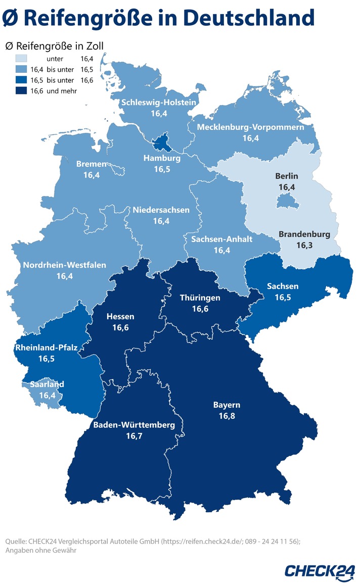 Im Norden der Bundesrepublik sind Autoreifen kleiner als im Süden. Die kleinsten Durchmesser haben Pneus in Brandenburg. Sie kommen lediglich auf 16,3 Zoll.
