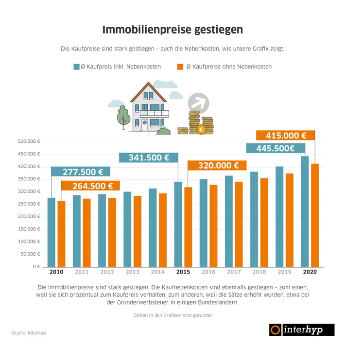 München (ots) – Die Immobilienpreise und Darlehenssummen sind im Corona-Jahr 2020 stärker gestiegen als in den Vorjahren. Das berichtet Interhyp auf der Basis der Analyse von 700.000 Finanzierungen im Zeitraum von 2010 bis 2020. „Die extrem günstigen Zinsen für Immobilienkredite verbunden mit dem Wunsch nach Sicherheit und mangelnden Anlagealternativen haben in der Krise zu einer hohen Nachfrage nach Immobilien und Finanzierungen geführt“, sagt Jörg Utecht, Vorstandsvorsitzender der Interhyp AG, Deutschlands größtem Vermittler für private Baufinanzierungen. Der durchschnittliche Immobilienpreis in Deutschland inklusive Nebenkosten im Jahr 2020 beträgt laut Interhyp-Daten rund 446.000 Euro. Im Jahr 2019 kostete der Immobilienkauf oder -bau im Durchschnitt noch 403.000 Euro. Der Anstieg liegt damit bei mehr als zehn Prozent und über den Steigerungen der drei Vorjahre, die bei rund fünf Prozent oder weniger lagen. Auch die Darlehenssummen bei Erstfinanzierungen sind um fast zehn Prozent auf 330.000 Euro stärker als in den Vorjahren gestiegen. Die günstigen Zinsen erlauben dennoch in vielen Fällen leistbare Raten, berichtet Interhyp. So liege die durchschnittliche monatliche Rate 2020 bei rund 1.070 Euro, im Vergleich zu rund 925 Euro im Jahr 2010. Eine Hürde für den Wohneigentumserwerb könne das Eigenkapital sein. Es liegt 2020 im Durchschnitt bei 115.000 Euro. Im Jahr 2010 waren es 83.000 Euro. Jörg Utecht: „Die hohen Kaufnebenkosten und Immobilienpreise erfordern mehr Eigenkapital als früher und sind für viele eine Hürde für den Wohneigentumserwerb. Gezielte Fördermittel und niedrigere Kaufnebenkosten könnten den Menschen den Weg ins eigene Zuhause erleichtern.“