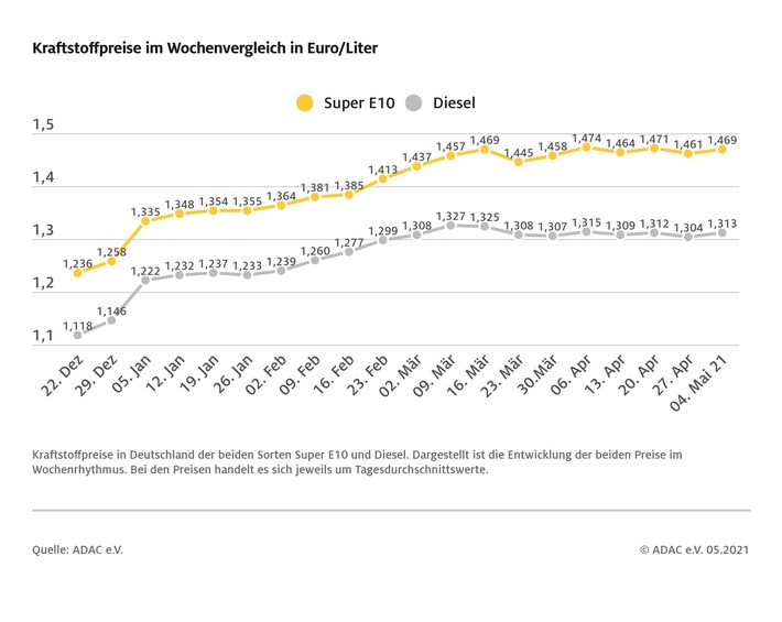 München (ots) – Die Autofahrer müssen beim Bezahlen ihrer Tankrechnungen derzeit etwas tiefer in die Tasche greifen als noch vor einer Woche. Wie die aktuelle ADAC Auswertung der Kraftstoffpreise in Deutschland zeigt, kostet ein Liter Super E10 im bundesweiten Mittel 1,469 Euro und damit 0,8 Cent mehr als vor Wochenfrist. Auch der Preis für Dieselkraftstoff ist etwas gestiegen. Erliegt im Schnitt bei 1,313 Euro, das ist ein Plus von 0,9 Cent.