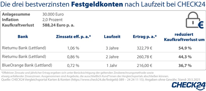 München (ots) – Mit Festgeldkonten federn Verbraucher*innen den Kaufkraftverlust ihrer Ersparnisse ab. Denn lassen sie 30.000 Euro auf einem nicht verzinsten Konto liegen, verliert ihr Geld durch die Inflationsrate von aktuell 2,0 Prozent innerhalb eines Jahres rund 588 Euro an Kaufkraft.1) Zudem müssen Sparer*innen auch mit Negativzinsen auf ihren Girokonten rechnen. Dann kommt beispielsweise ein Wertverlust von 0,5 Prozent hinzu. Bei 30.000 Euro ist das ein jährlicher Verlust in Höhe von 150 Euro.2)
