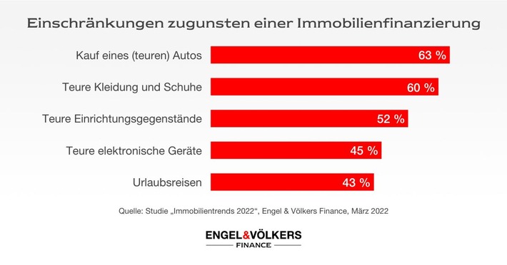 Neben Abstrichen bei der Immobilie selbst sind viele der Befragten auch bereit, den eigenen Konsum für den Traum vom Eigenheim zu verringern. 43 Prozent würden auf Urlaubsreisen verzichten, um eine Immobilie erwerben oder schneller abbezahlen zu können. Fast die Hälfte der Befragten gab an, kein teures Auto anzuschaffen. Und auch bei Konsumgütern gibt es Sparpotenzial: So wären knapp zwei Drittel bereit, nicht mehr in teure Kleidung und Schuhe zu investieren, über die Hälfte würde keine teuren Einrichtungsgegenstände mehr kaufen und 45 Prozent würden auf die Anschaffung elektronischer Geräte wie TV oder Smartphone verzichten.