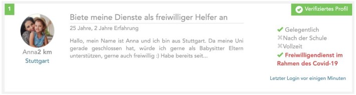In den Metropolen wie Berlin, Hamburg, München, Köln und Düsseldorf, haben sich bereits so viele freiwillige Helfer registriert, dass sie teilweise enttäuscht den Kundensupport nach Aufträgen fragen. Deshalb sind die Hilfsangebote selbstverständlich nichtsdestoweniger wert. Yoopies hat in der Folge den Zugang zur Kinderbetreuungsvermittlung bis auf Weiteres für alle Eltern, die nicht von zu Hause arbeiten können, kostenfrei geöffnet.