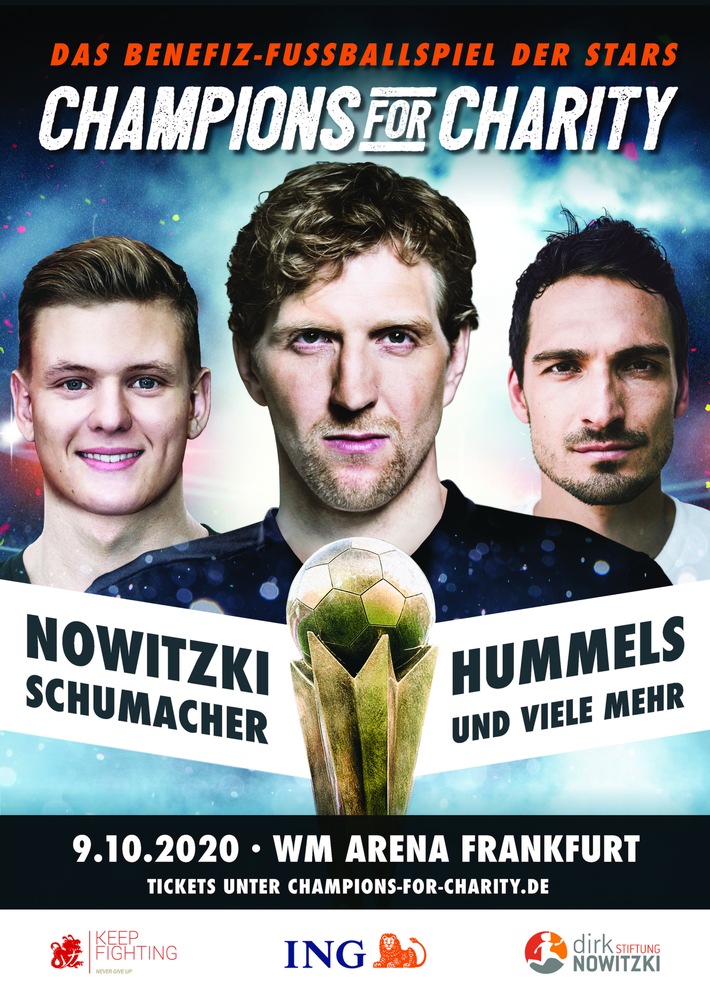 Basketball-Legende Dirk Nowitzki, Formel 2-Pilot Mick Schumacher und Fußball-Weltmeister Mats Hummels kommen am Sonntag, 17. Mai 2020 zum Benefiz-Fußballspiel „Champions for Charity“ nach Frankfurt. Zusammen mit vielen aktiven und ehemaligen Top-Sportlern spielen sie in zwei All-Star-Teams zu Ehren von Formel 1 Legende Michael Schumacher in der Commerzbank-Arena. Die Erlöse des Spiels kommen dem 41 Campus Projekt der Dirk Nowitzki Stiftung und Projekten der Keep Fighting Foundation der Familie Schumacher zu Gute. Veranstaltungsbeginn mit Rahmenprogramm und Musik-Act ist um 17.30 Uhr, Anstoß um 18.00 Uhr.