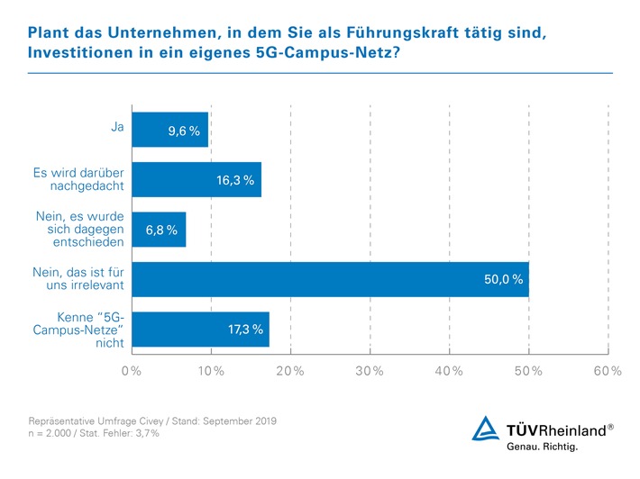 Großes Potenzial sieht der Experte vor allem in der Industrie und in der Automobilbranche. Effizientere Produktion, vorausschauende Wartung und geringere Ausschuss-Quoten sind nur einige Vorteile einer vernetzten Produktion. Allerdings zeigt sich: „In vielen Firmen fehlt das Know-how, um den Nutzen eines 5G-Campus-Netzes zu erkennen bzw. einzuschätzen“, so Windolph. Auch eine von TÜV Rheinland beauftrage Umfrage des Marktforschungsinstituts Civey zeigt, dass die Mehrzahl der 2.000 befragten Führungskräfte in Deutschland ein Campus-Netz im Betrieb für nicht relevant hält (50 Prozent) oder die Möglichkeit von Campus-Netzen nicht kennt (17,3 Prozent). Beratungen zu Ausbau, Nutzen und Betrieb eines firmeneigenen 5G-Netzes sowie Machbarkeitsstudien bieten Unternehmen wie TÜV Rheinland an. Mittels einer speziellen Software erstellt der international tätige Prüfdienstleister ein digitales Abbild des Firmengeländes und ermittelt darauf basierend zum Beispiel die benötigte Anzahl an 5G-Antennen. Auch in Bezug auf ein geeignetes Betriebsmodell, Wartung und Cybersicherheit des Netzes erhalten Firmen auf Wunsch Unterstützung.