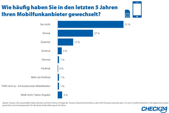 Überraschendes Ergebnis einer repräsentativen YouGov-Umfrage im Auftrag von CHECK24: 51 Prozent der Deutschen haben in den vergangenen fünf Jahren darauf verzichtet, ihren Mobilfunkanbieter zu wechseln. Immerhin 27 Prozent nutzten einmal die Gelegenheit für einen Vertragswechsel. Nur fünf Prozent wechselten dreimal oder häufiger ihren Anbieter.*