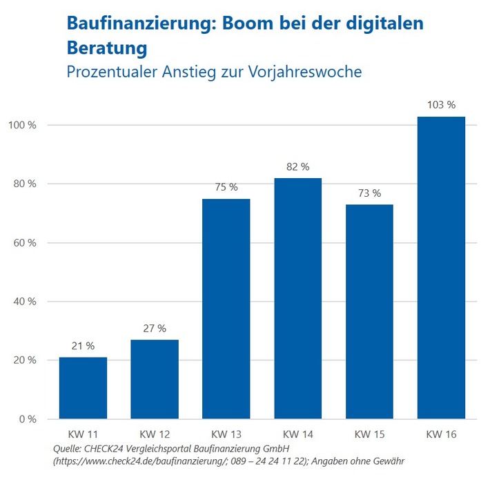 *Quelle: CHECK24; eigene Berechnungen, Prozentuale Steigerung der digitalen Beratungen in der Baufinanzierung in 2020 gegenüber 2019.