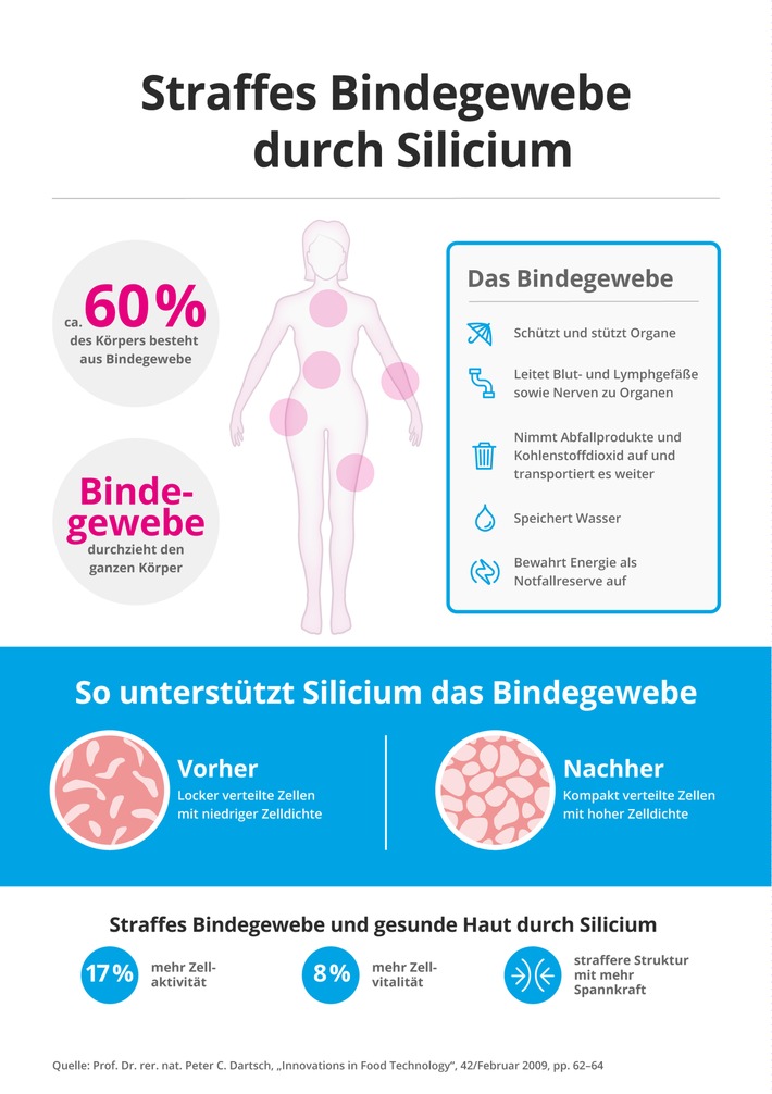Das Spurenelement Silicium ist verantwortlich für den Zellaufbau und das -wachstum. Kein anderer Stoff ist in der Lage, so viel Wasser und Giftstoffe zu binden: nämlich bis zum 300-Fachen seines eigenen Gewichts. Bei einem schwachen Bindegewebe können Kuren mit Silicium helfen – zum Beispiel mit Hübner Original silicea® Balsam aus dem Reformwarenfachhandel oder dem Drogeriemarkt. Silicium-Gel unterstützt die Bildung der Bindegewebsfasern Kollagen und Elastin und sorgt so für feste, elastische und geschmeidige Haut. Außerdem erhöht sich die Wasserbindungsfähigkeit, die Spannkraft steigt und Schlacken und Zellgifte werden abtransportiert. Wichtig ist hierbei das Durchhaltevermögen: Erst nach einigen Wochen sind Ergebnisse sichtbar. Eine Einnahme über mindestens 3 Monate ist daher empfohlen.